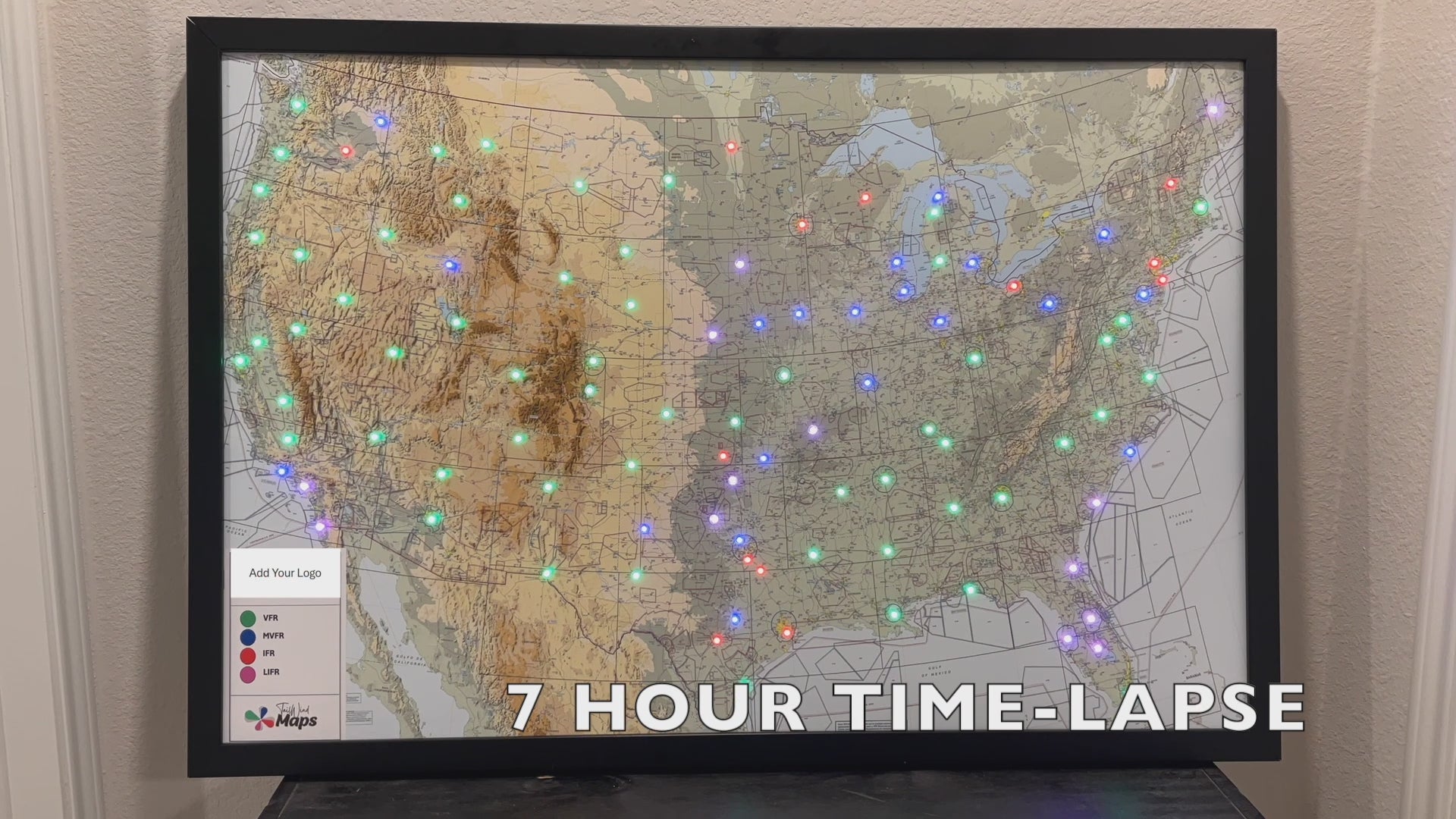 - Real-time weather updates: Lights indicate live conditions for 100+ airports, with colors mapped to flight categories and refreshed every 5 minutes.